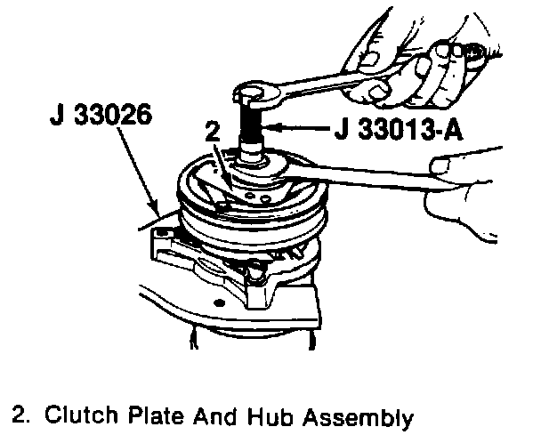 ^ Hold the clutch plate and hub assembly (2) steady using J 33027.