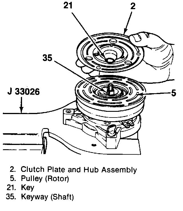 ^ Do not drive or pound on the clutch hub or the shaft (20). Internal damage to the compressor may result.