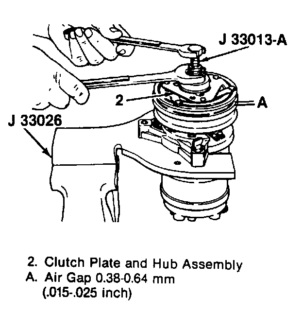 ^ Measure the air gap between contact surfaces of the clutch plate and hub assembly (2) and the pulley (5). The gap should be 0.38-0.64 mm (0.015-0.025-inch).