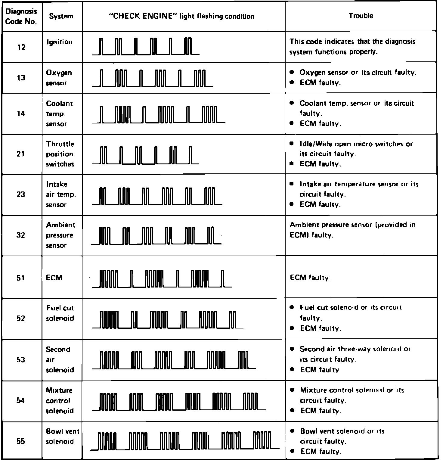 When the ignition switch and the diagnosis switch, Fig. 38, are turned ``On,'' the ``Check Engine'' lamp indicates code 12 three times, then the trouble codes three times each, and continues to cycle between code 12 and the trouble code (13) as shown (A), Fig. 39. Code 12 consists of one flash, a short pause, then two flashes, which indicates the system is functioning properly. The code following code 12 is a trouble code, which means that trouble has occurred in the system to which the particular code corresponds.
