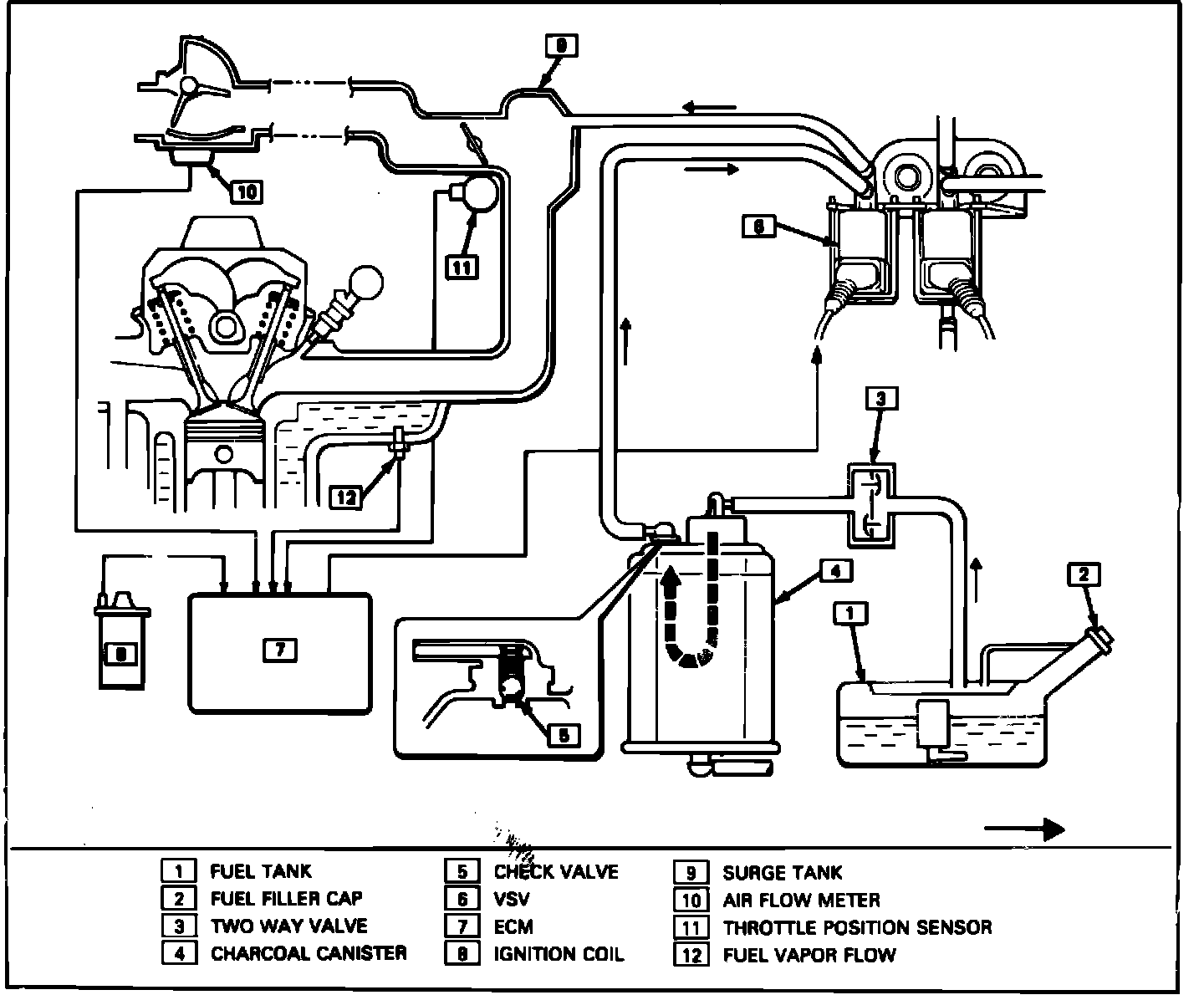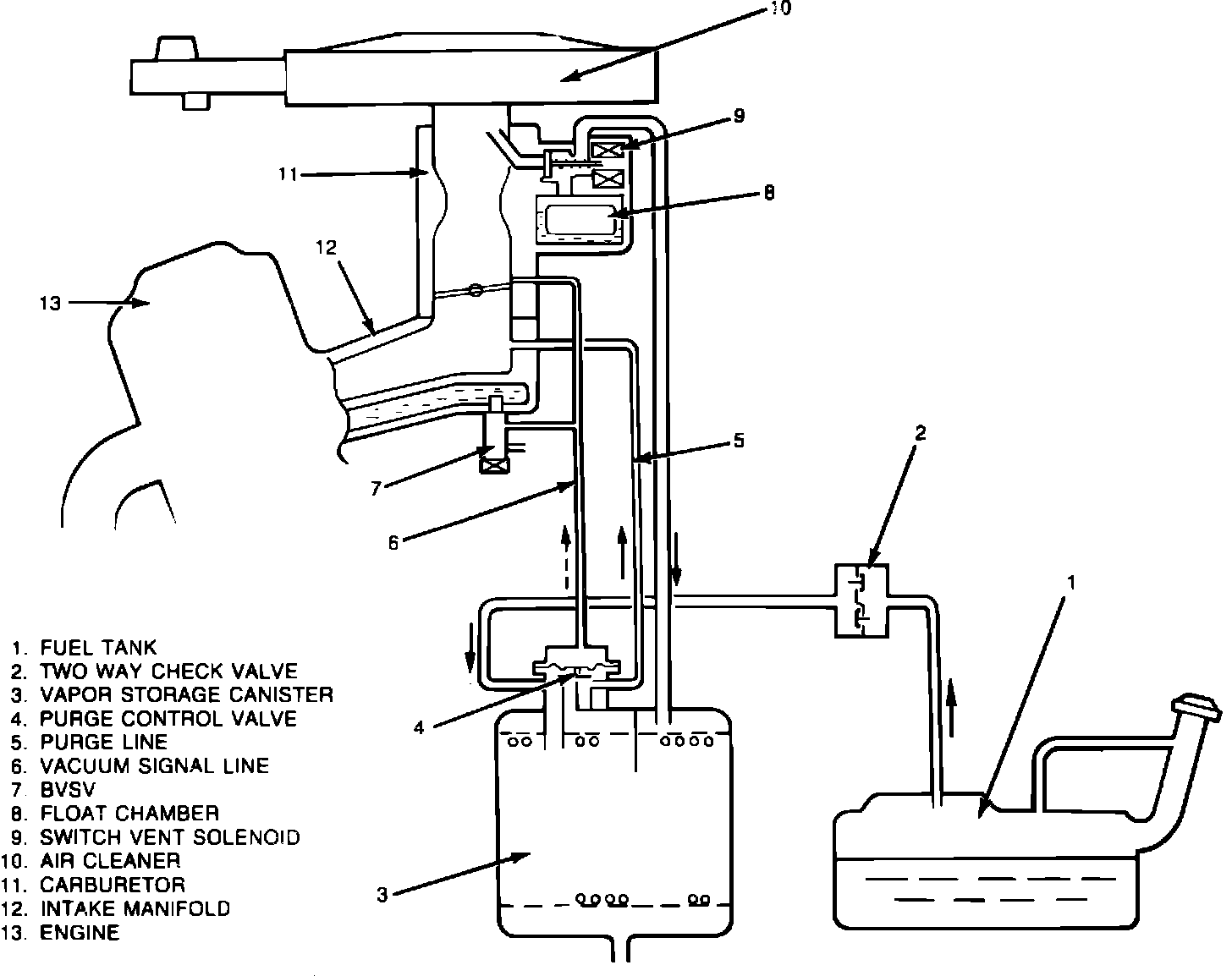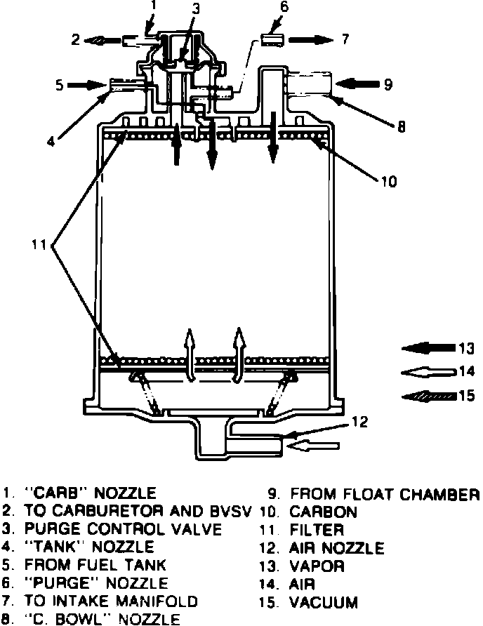 Fuel vapors from the fuel tank and carburetor float chamber are vented to the canister which contains charcoal. When the engine is running, manifold vacuum is applied to a purge control valve on the canister. The purge valve opens and allows the fuel vapors to be drawn into the intake manifold through the purge line. Air is drawn in through a filter in the bottom of the canister, Fig. 5.