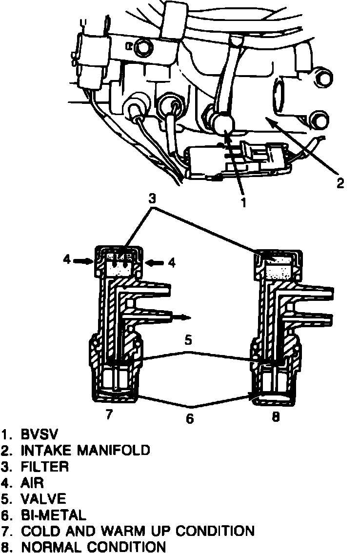 Fuel vapors are not purged while coolant temperature is low. The BVSV bleeds off the vacuum which would otherwise be applied to the purge valve. As coolant temperature rises, the BVSV closes off the vacuum bleed, thus directing full manifold vacuum to the purge valve, Fig. 6.