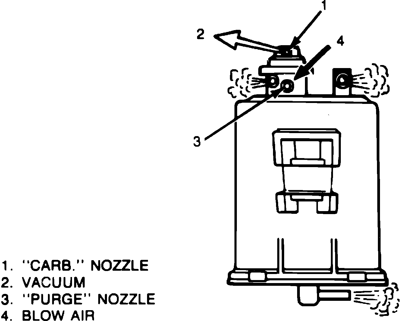 3. Apply a vacuum of at least 3.15 inches Hg (80 mm Hg) to CARB nozzle and blow air into PURGE nozzle. Air should escape from TANK and C. BOWL nozzles and air nozzle at bottom of canister, Fig. 10.