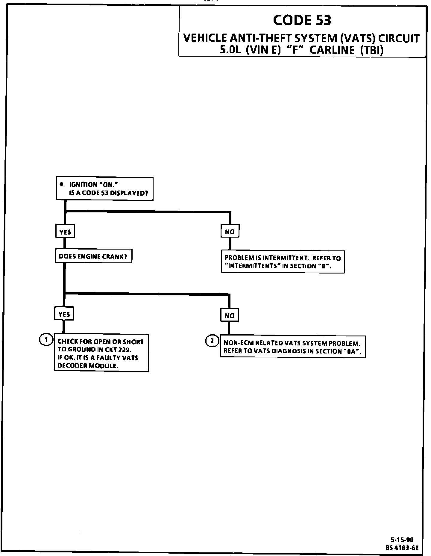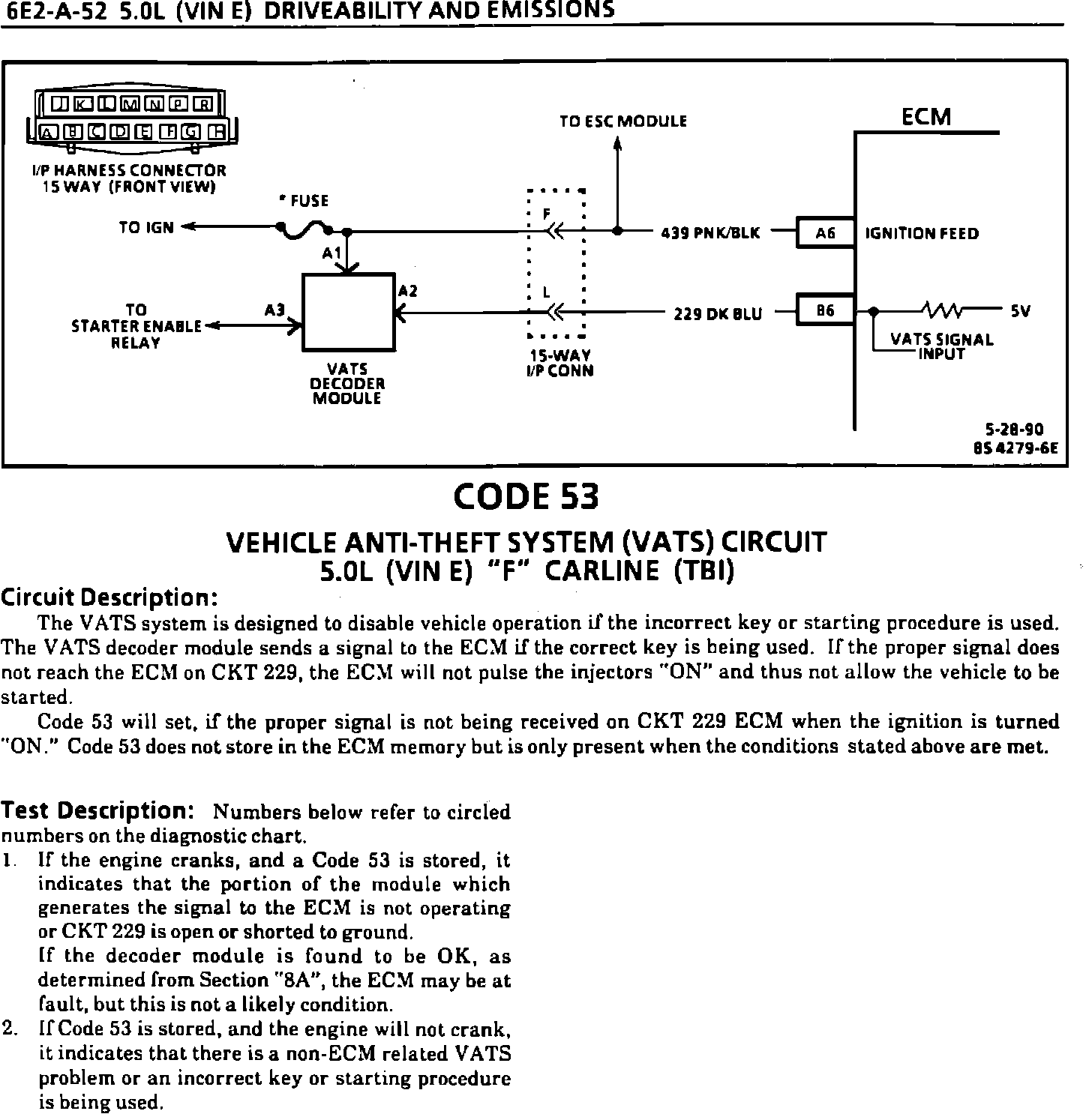 The Code 53 Vehicle Anti-Theft System (VATS) service diagnostics for the 1989 5.0L LO3 (VIN E) "F" car have been revised.