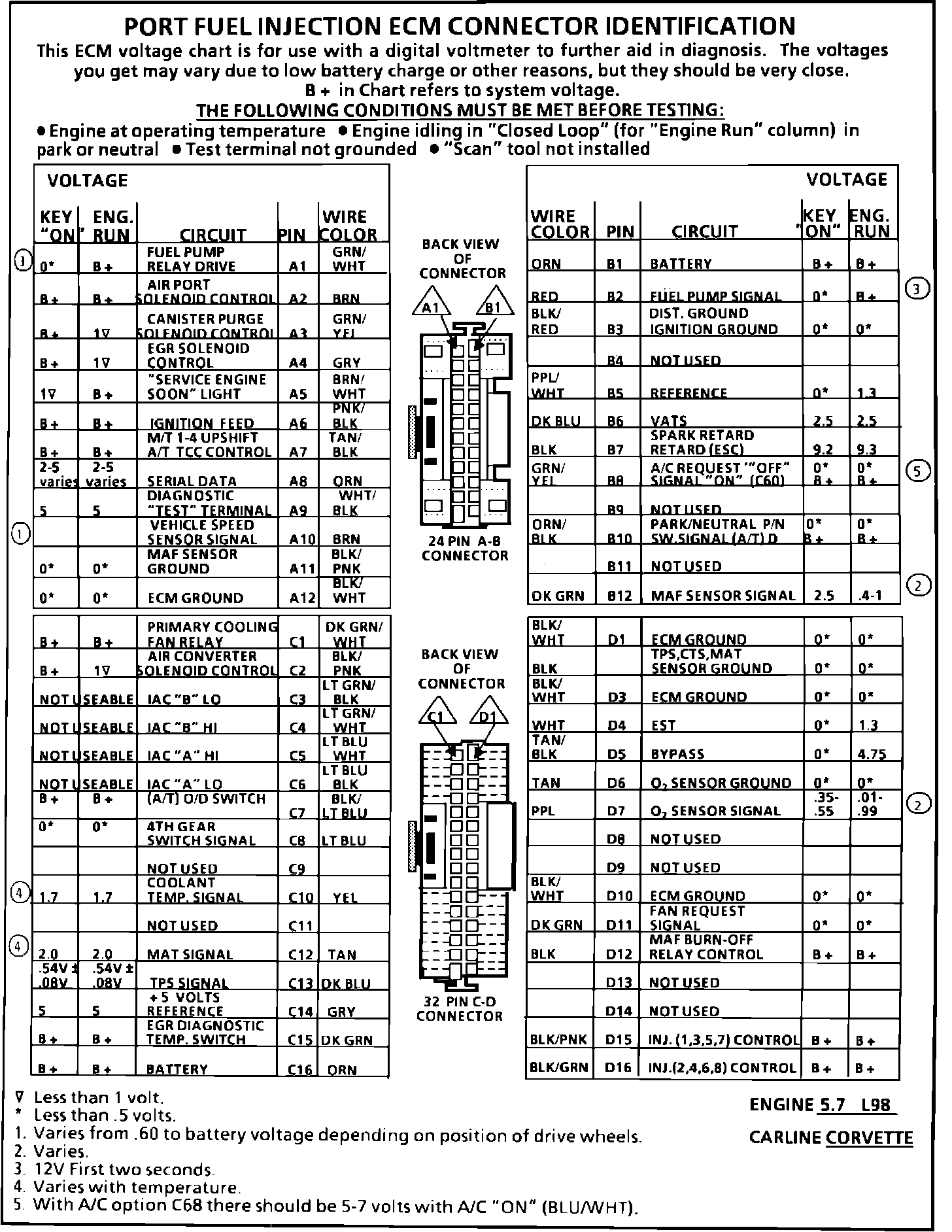 ECM Connector Terminal Identification And Voltage Specification: