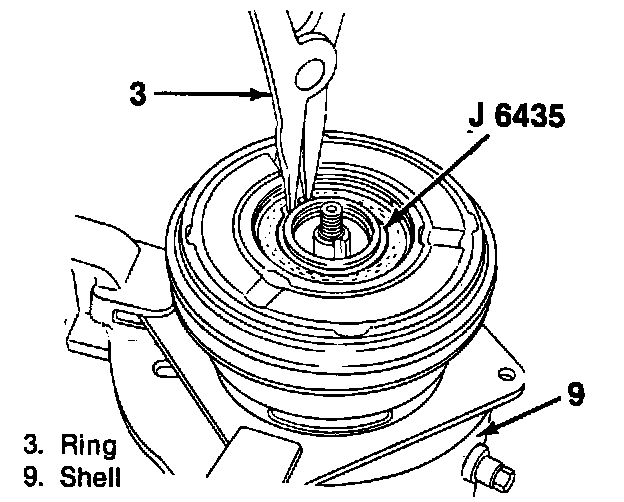 ^ Use J 9395 puller pilot to prevent internal damage to the compressor when removing the pulley. Do not use the pulley directly against the end of the shaft.