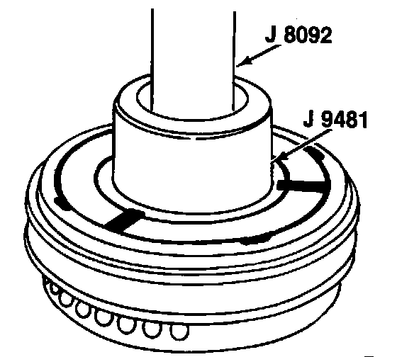 1. Bearing (5) to the pulley (6) with J 8092 and J 9481-A.