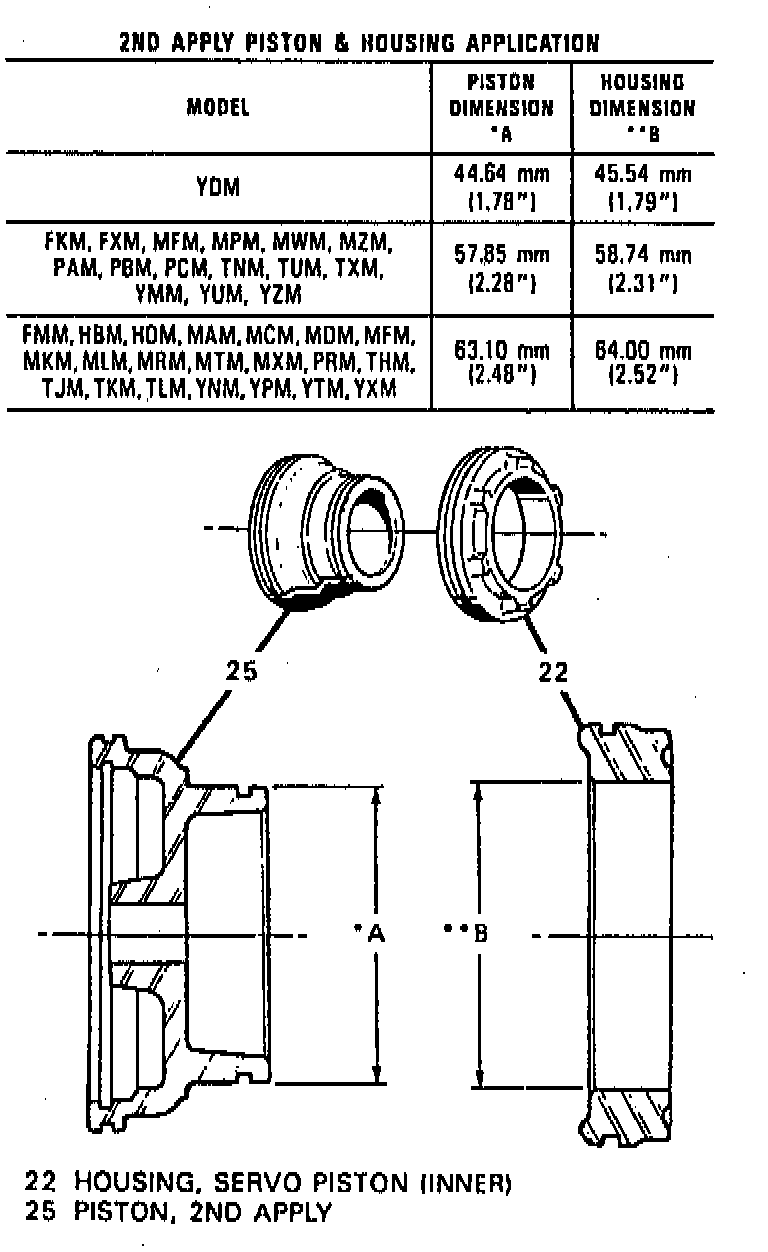 Changes to the second servo apply pin eliminates the need for the two ring seals used. This change eliminates the potential for seal damage during assembly. Beginning January 5, 1987 (Julian date 005) THM 700-R4 transmissions are built with a new servo apply pin. However, the new second servo apply piston pin can be used on all model transmissions. If the past design second servo apply pin is used, seal rings must be installed. Three different pin lengths are used, 2.61-2.62 inch (part No. 8667571 with identification 2 rings), 2.67-2.68 inch (part No. 8667572 with identification 3 rings) and 2.72-2.73 inch (part No. 8667573 with identification wide band).Fig. 7, 2-4 servo pin selection:
