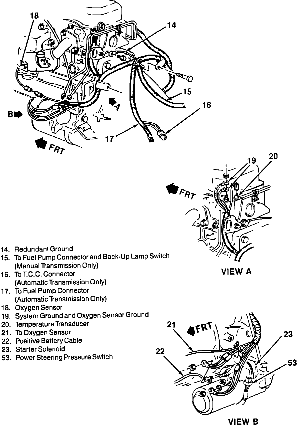 15 = TO FUEL PUMP CONNECTOR AND BACK-UP LAMP SWITCH (MANUAL TRANSMISSION ONLY).