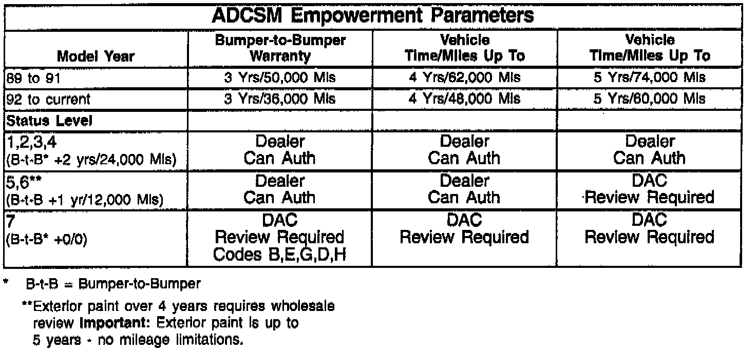 The purpose of this Bulletin is to provide Retail Service Management with a matrix (See Figure) that supports the recently announced dealer empowerment or self-authorization levels and how these new levels relate to Chevrolet's ADCSM program.