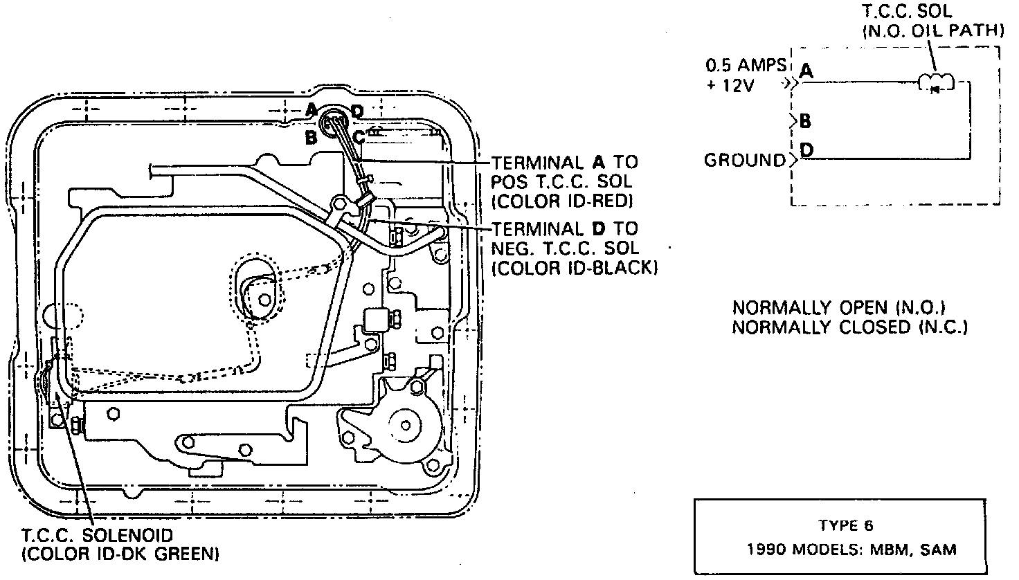 16. Select the proper transmission model code from the images - the model code designation is found within a box in the image. Correctly route and connect solenoid assembly wiring. The wire connectors are color coded to correspond to the information in the wiring diagram. On switches which take two connectors, the terminals are reversible.