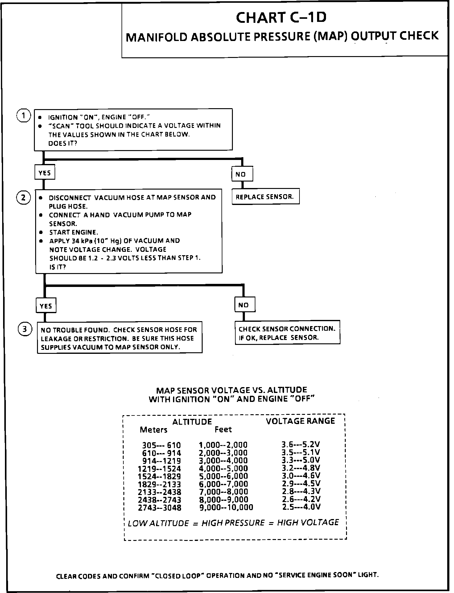 1. Checks MAP sensor output voltage to the ECM. This voltage, without engine running, represents a barometer reading to the ECM.