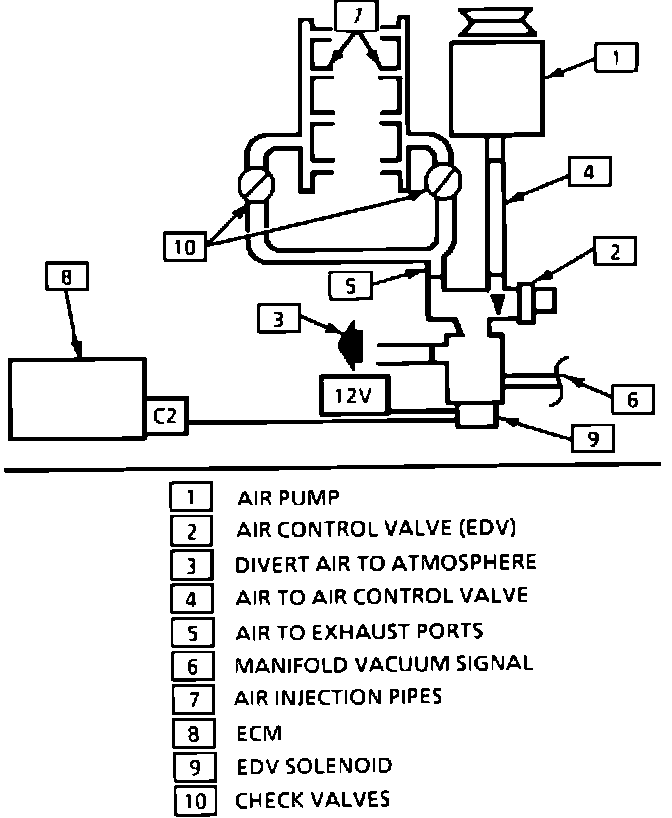 Air flows from the pump to atmosphere or to the exhaust ports. An electric solenoid controls the Electric Diverter Valve (EDV). The ECM controls the ground circuit in order to energize the solenoid.