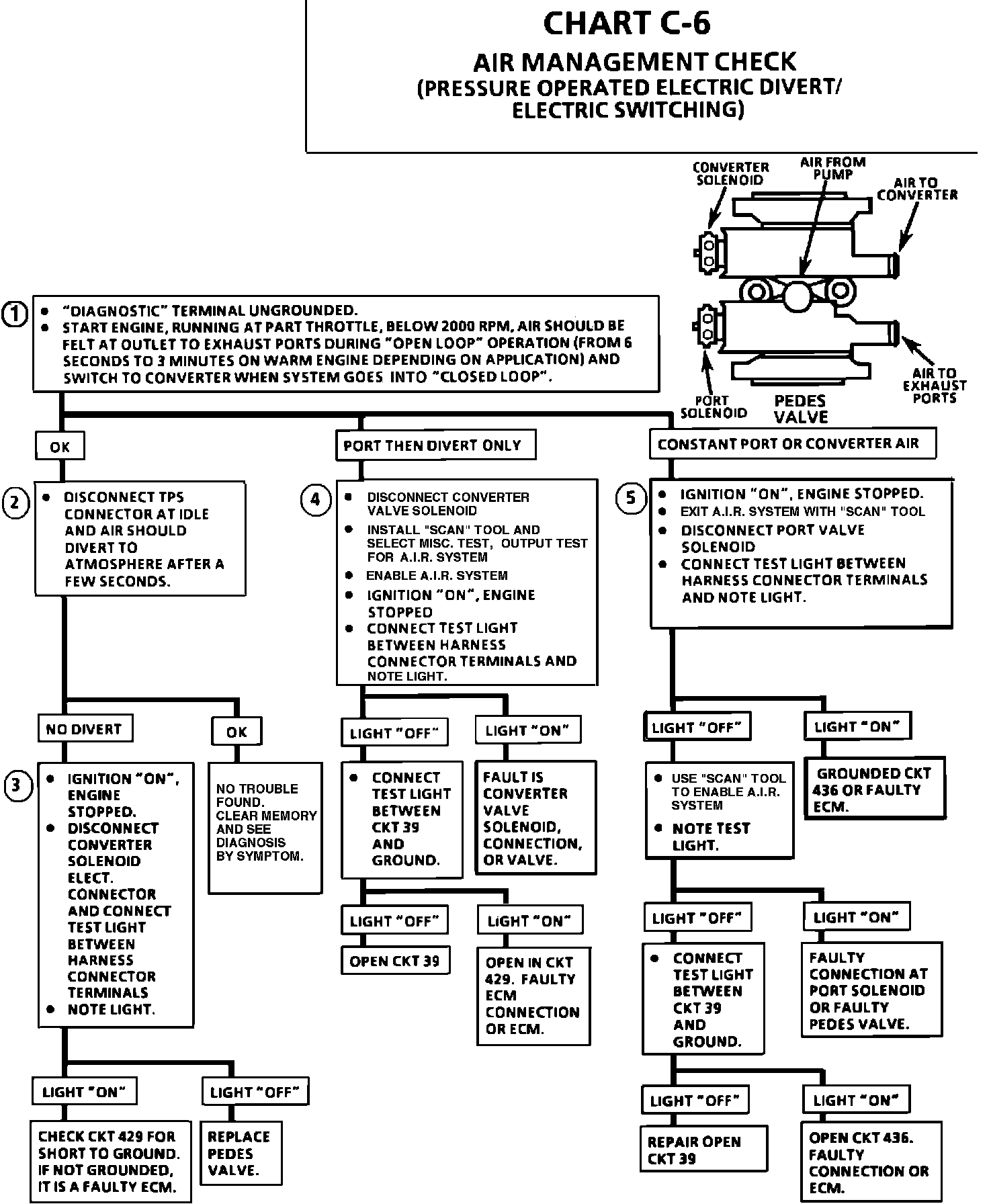 The air management system is controlled by a port and a converter valve. Both valves are controlled by the ECM. When the solenoid is grounded by the ECM, the A.I.R. pump pressure will activate the valve and pump air will be directed as follows. During cold start, the port solenoid is energized, which opens the port valve, and air is directed into the exhaust ports. As coolant temperature increases, or system goes into "Closed Loop", the port solenoid is de-energized, and the converter solenoid is activated, which allows the converter valve to be seated, and air is forced to the catalytic converter. If both solenoids are powered off, the air will be diverted to the atmosphere.
