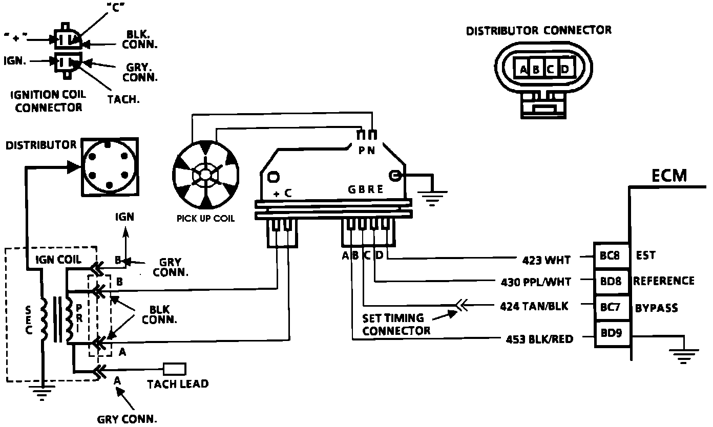 3. Terminal "B" is the bypass circuit. At about 400 rpm the ECM applies 5.0 volts to this circuit to switch spark timing control from the HEI module to the ECM. An open or grounded bypass circuit will set a Code 42 and the engine will run at base timing, plus a small amount of advance controlled by the HEI module.