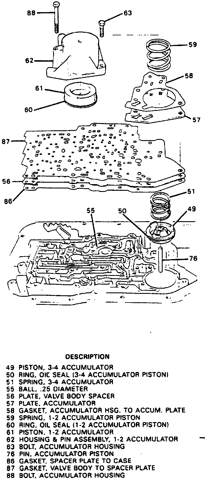 16. Remove 3-4 accumulator piston, spring and pin. Note position of 3-4 accumulator piston and spring. These parts must be installed in their original position.
