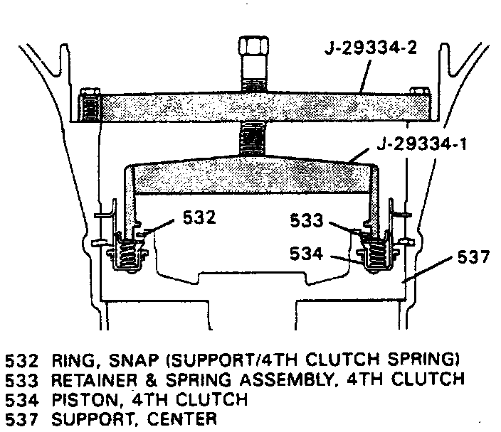 31. Install J-29334-1 from fourth clutch compressor J-29334 or equivalent on fourth clutch spring and retainer, then install J-29334-2 from fourth clutch compressor J-29334 or equivalent on case.