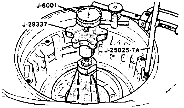 b. Install forward and direct endplay checking device J-29337, post tool J-25025-7A and dial indicator J-8001 or their equivalents.