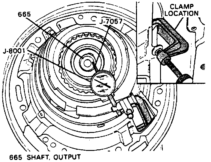 d. Zero dial indicator, then lift on J-29337. Endplay should be 0.022 - 0.051 inch. Refer to chart for proper washer thickness. Do not remove output shaft and rear unit support fixture J-25013 or output shaft support fixture J-29332.
