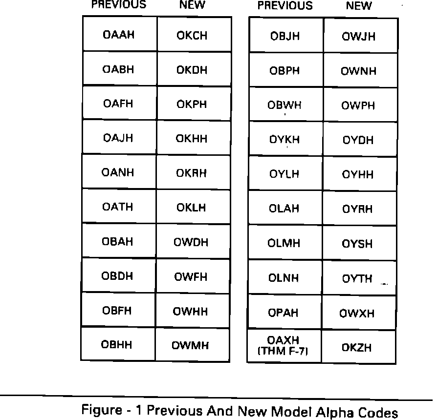 IMPORTANT: The shift speed charts, minimum and maximum oil pressures and wiring diagrams have not changed. Use the cross-reference chart in Figure 1 to find the previous 1990 model; then reference previous model data listed (oil pressure, wifing diagrams and shift speed charts) to service the new 1990 model. For example, the new 1990 model OWMH will be serviced by the 1990 OBHH model data.