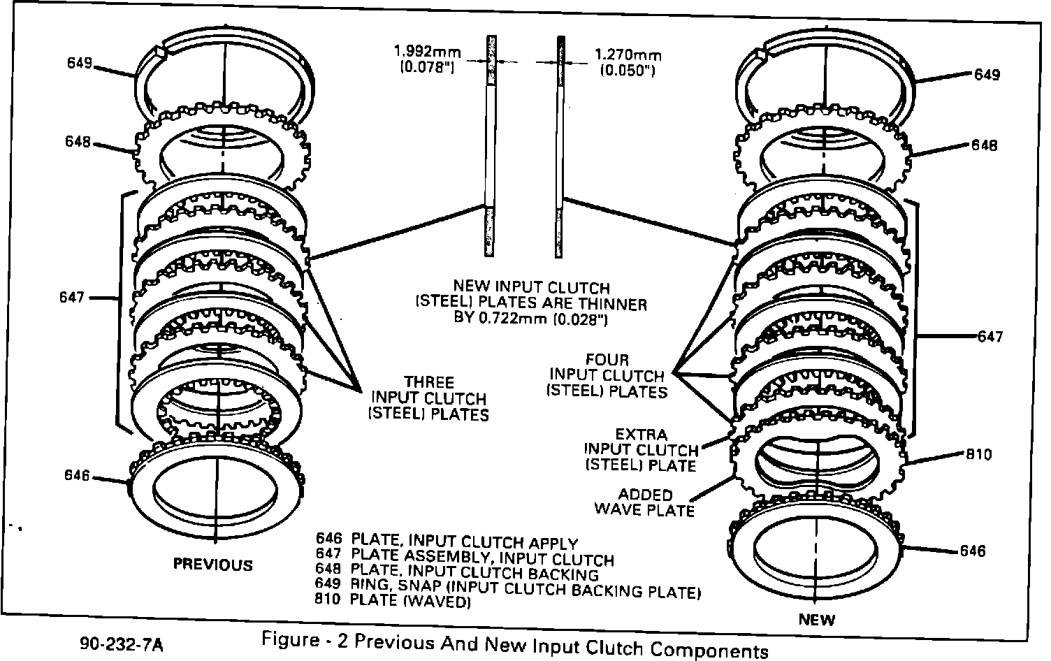 ^ Four instead of three input clutch (steel or reaction) plates (647). The new input clutch plate will assemble between the added wave plate (810) and input clutch (fiber) plate assembly. (The new input clutch plates will also be thinner by 0.722 mm (0.028") to make room for the added wave plate and input clutch plate.) The previous input clutch plates will still be available. Do not mix the previous and new input clutch plates; this will cause a durability concern.