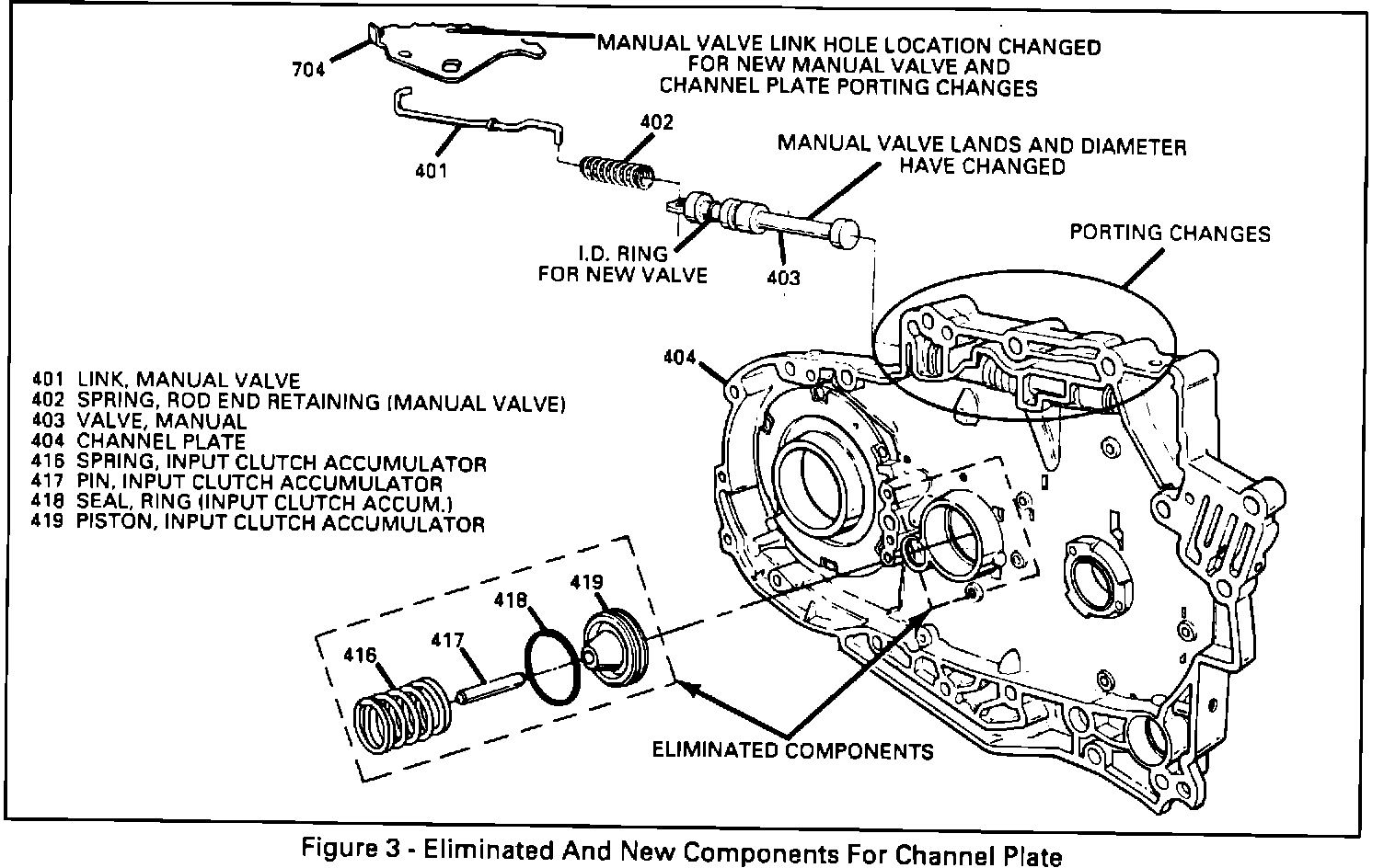 ^ Channel plate (404) will not have the input clutch accumulator bore and components. A wave plate will be added to the input clutch assembly that will replace the function of the accumulator. The new channel plate will also have porting changes that will help ensure that two ports will never be opened simultaneously, which causes distress to the 4th clutch assembly when the shift cable is not set correctly or is kinked or binding. The previous channel plate with the input accumulator bore and components and the new channel plate are not interchangeable. The channel plate with the input accumulator will still be available.