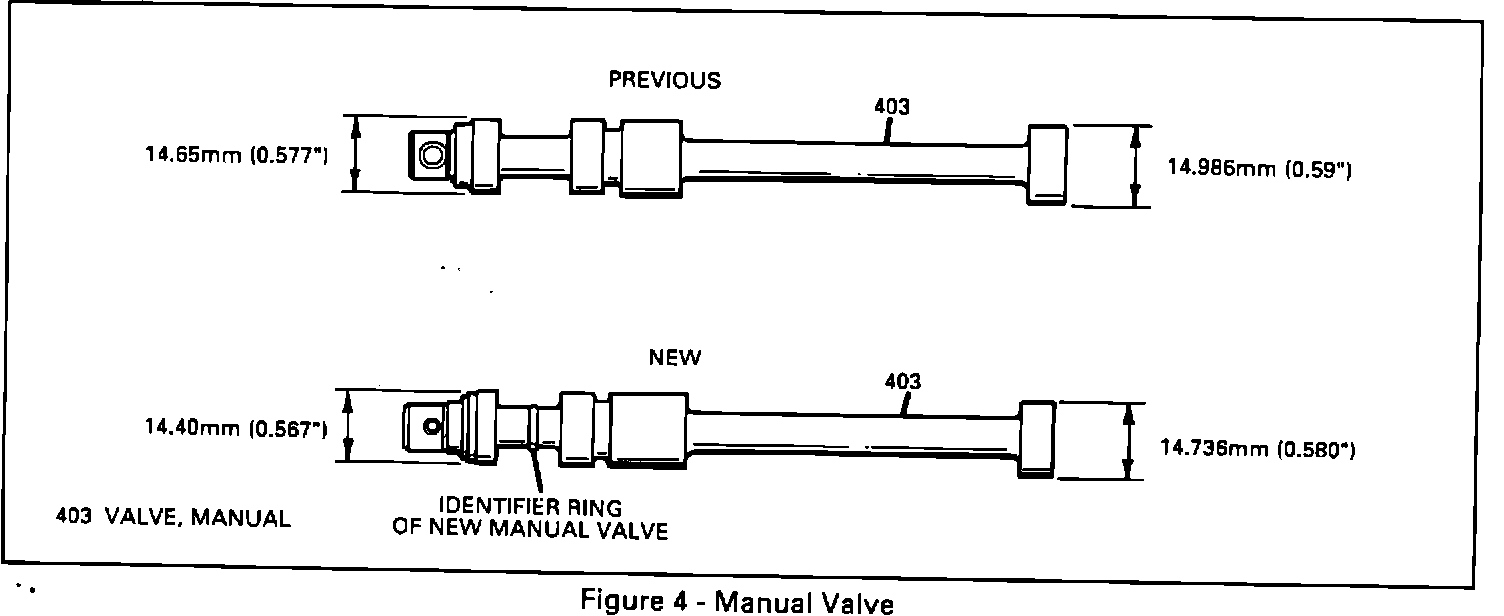 ^ New manual valve (403) will have changes to the valve lands and be reduced 0.25 mm (0.010") in diameter for the new porting changes to the channel plate. The previous and new manual valves are not interchangeable. The new manual valve will assemble into the previous production channel plate; but the transaxle will not function because of excessive leakage due to the differences in sizes.