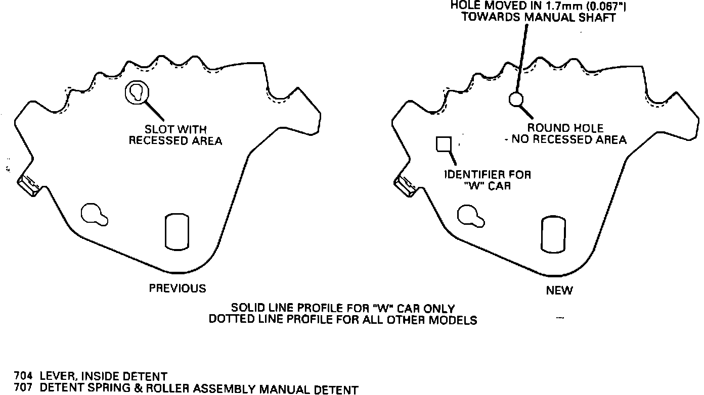 ^ New inside detent lever (704) will have the manual link hole location changed for a different "throw" of the manual valve. The previous and new inside detent lever are not interchangeable even though the parts will physically assemble. The new inside detent lever must be used with the new manual valve and channel plate. The previous inside detent lever must be used with the previous manual valve and channel plate. The identifier for the new "W" car inside detent lever is an added square hole. The previous "W" car inside detent lever is gold in color. Some of the early new "W" car inside detent levers may be gold in color and have the added square hole. The gold color will be discontinued and the square hole will be the only identifier for the new "W" car inside detent lever. The previous inside detent lever will still be available for models that just need replacement of the lever for 1987 and prior model years.