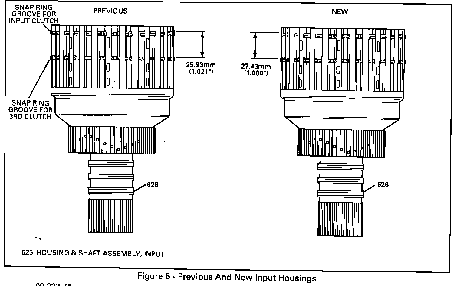 ^ Input housing (632) has been revised by moving the snap ring groove up 1.50 mm (0.059") to make room for the wave plate and extra input clutch plate in the input clutch. The previous and new input housings are not interchangeable because of the differences in clutch pack free play and travel. The previous input housing will still be available.