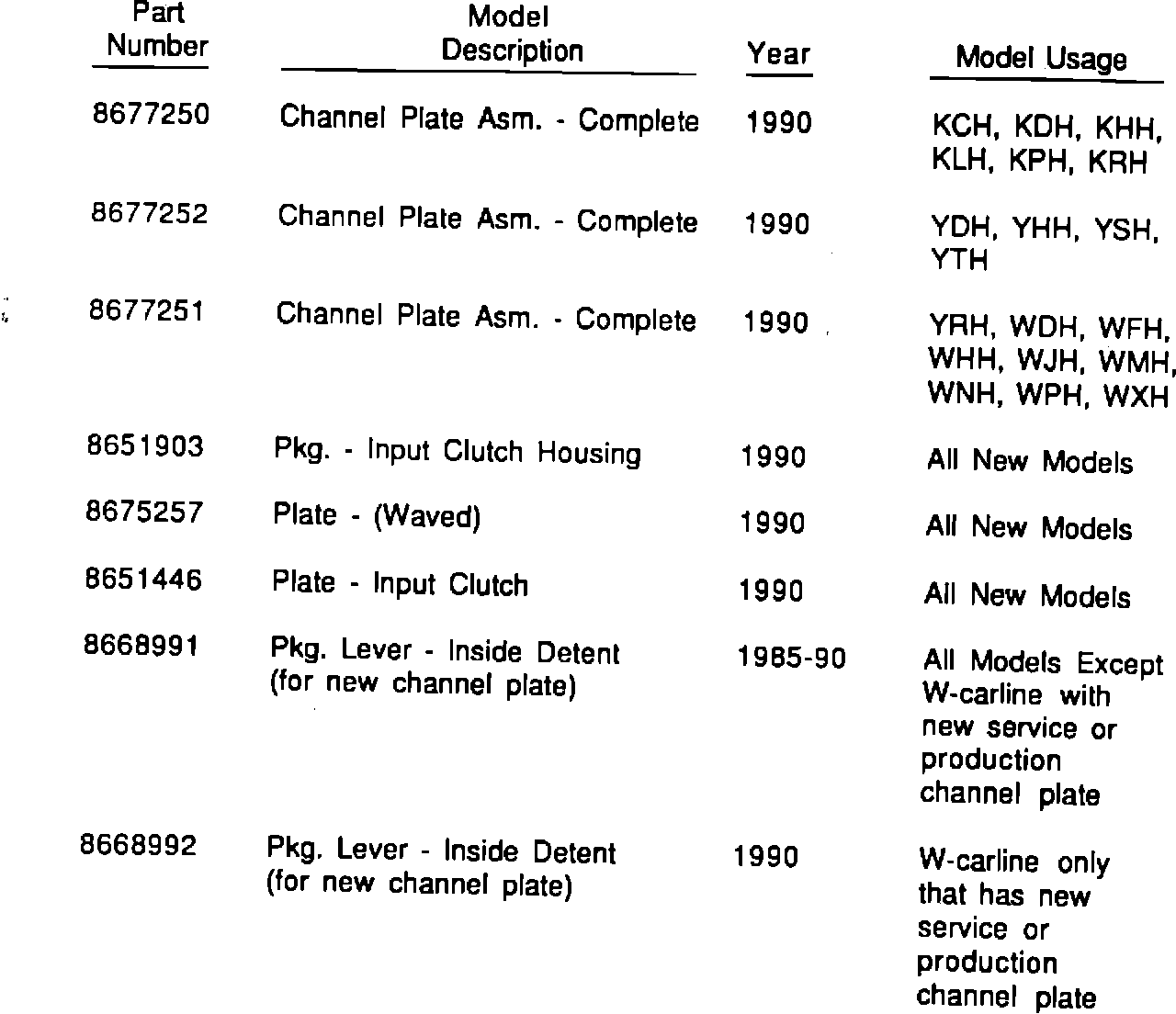 This bulletin covers new model codes for a new channel plate assembly that does not have an input accumulator and for a wave plate and extra input clutch plate that has been added to the input clutch. (See Figures 1 through 6.)