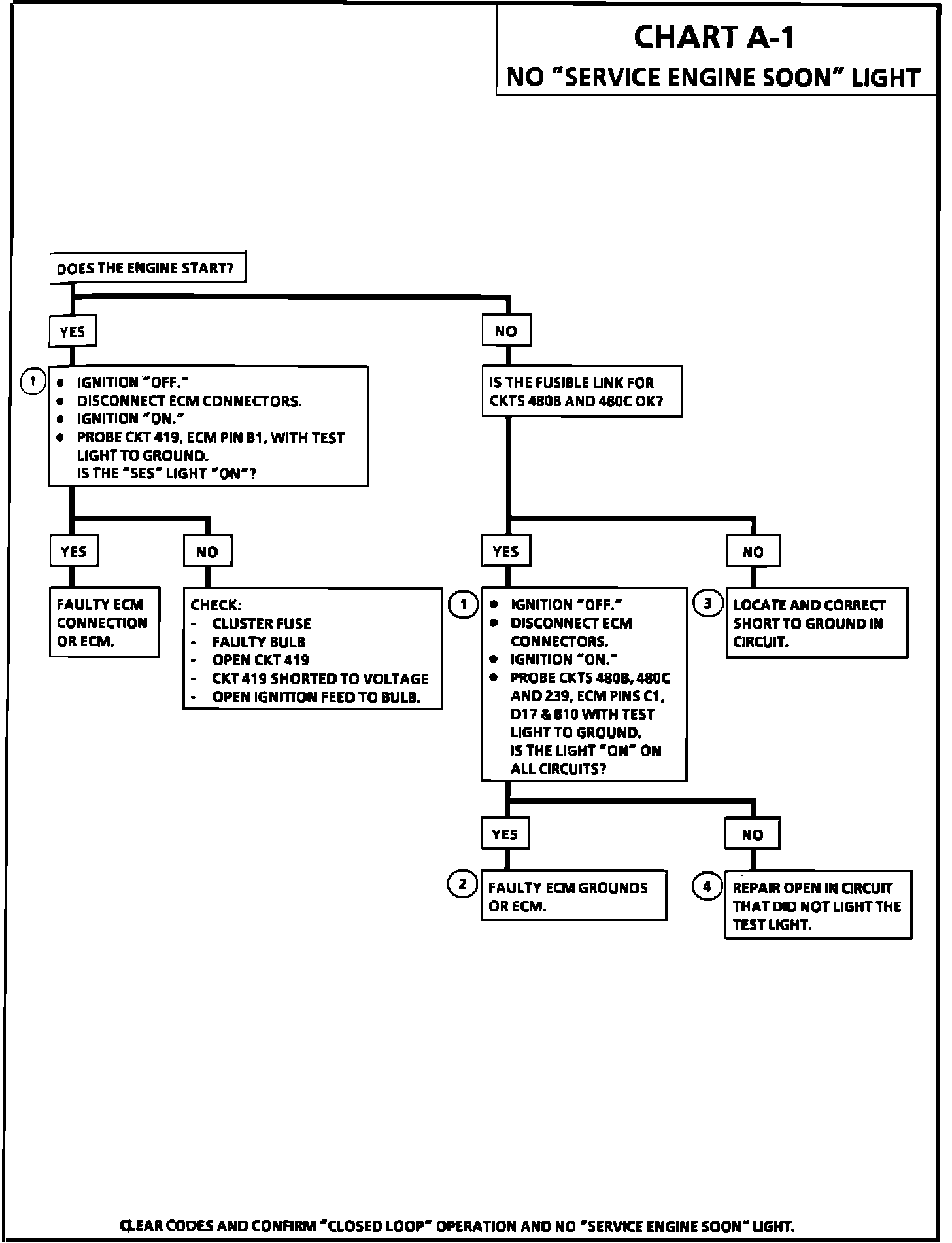 There should always be a steady "SERVICE ENGINE SOON" (SES) light when the ignition is "ON" and engine stopped. Battery is supplied directly to the light bulb. The Electronic Control Module (ECM) will control the light and turn it "ON" by providing a ground path through CKT 419 to the ECM.