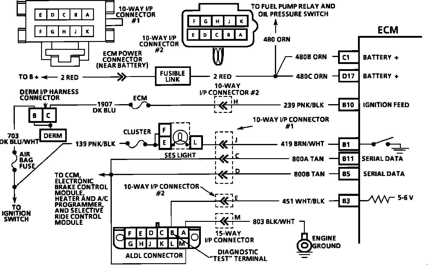 4. Make sure to check all 239 circuits if the ECM fuse is blown. Refer to SCHEMATIC DIAGRAMS/ELECTRICAL AND ELECTRONIC WIRING DIAGRAMS for ECM wiring information. The SIR system Diagnostic Energy Reserve Module (DERM) must be connected to the instrument panel harness or switched ignition voltage will not be supplied to the ECM and this will not allow the engine to start. Refer to SUPPLEMENTAL INFLATABLE RESTRAINT (SIR) DIAGNOSIS under /PASSIVE RESTRAINT/BODY ELECTRICAL SAFETY AND ENTERTAINMENT.