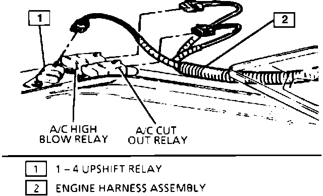 This upshift relay is located behind the battery on the cowl in the engine compartment. The ECM uses engine speed, vehicle speed, throttle position, and engine coolant temperature to determine if the vehicle is within the parameters to shift to 4th gear while in 1st gear. The ECM provides a ground path which energizes the relay when the vehicle should be shifted from 1st to 4th gear.