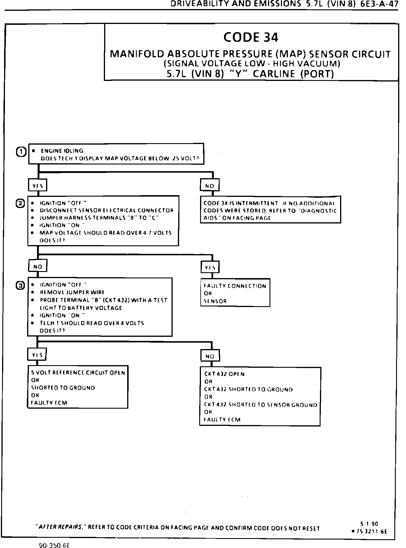 The attached Code 34 diagnostic chart replaces the diagnostic chart found in DRIVEABILITY AND EMISSIONS (SECTION 6E3) on page 6E3-A-47 of the 1990 "Y" 5.7L L98 (VIN 8) Corvette Service Manual.