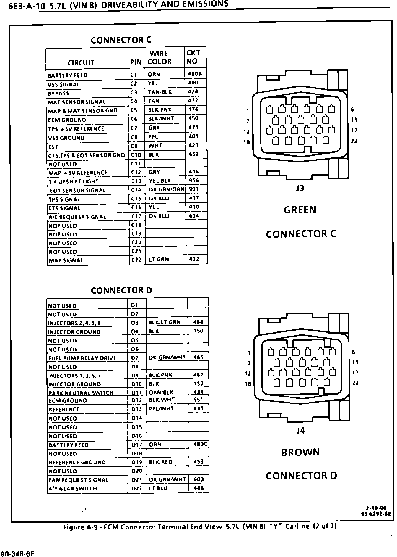 The attached ECM Terminal End View Chart replaces the chart found in DRIVEABILITY AND EMISSIONS (SECTION 6E3) on page 6E3-A-10 of the 1990 "Y" 5.7L L98 (VIN 8) Corvette Service Manual.