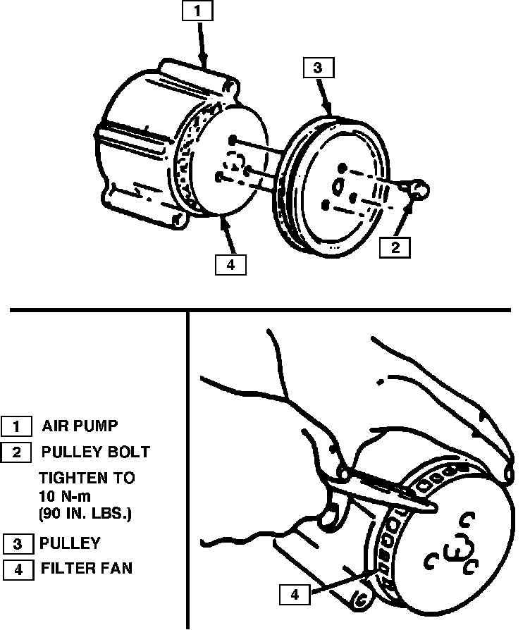 2. Place new fan filter on hub if necessary, then spacer and pump pulley against centrifugal filter fan. Tighten pulley bolts equally to 18 lb ft to press the filter on to the pump. Do not hammer on filter. If new filter is installed it may squeal until seated on pump.