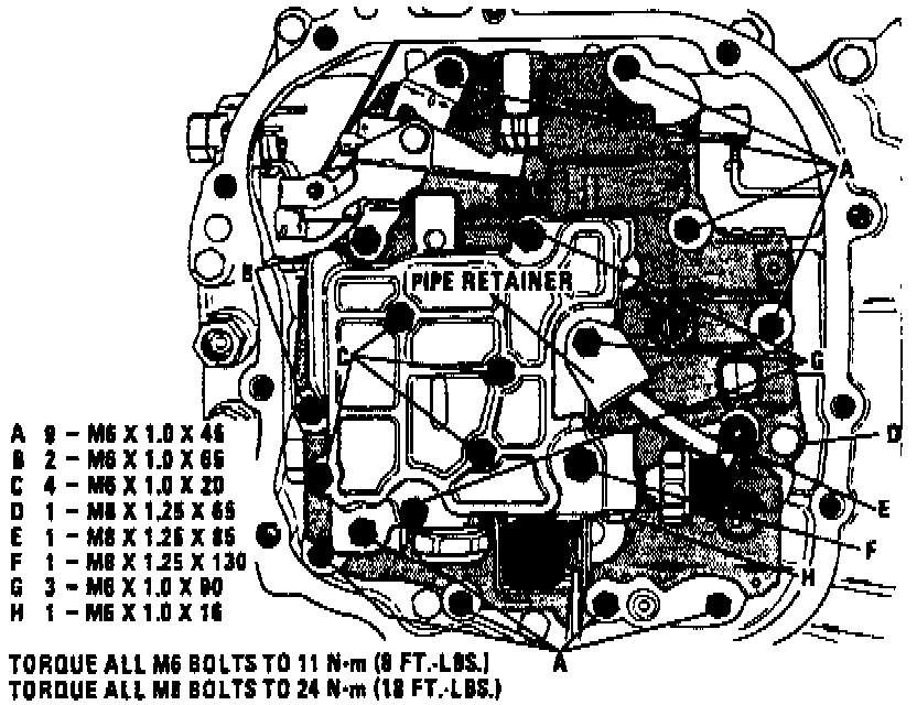 8. Install valve body assembly onto case cover, then install valve body pipe retainer and attaching bolts as shown in Fig. 78. Apply suitable sealant to bolt "F".
