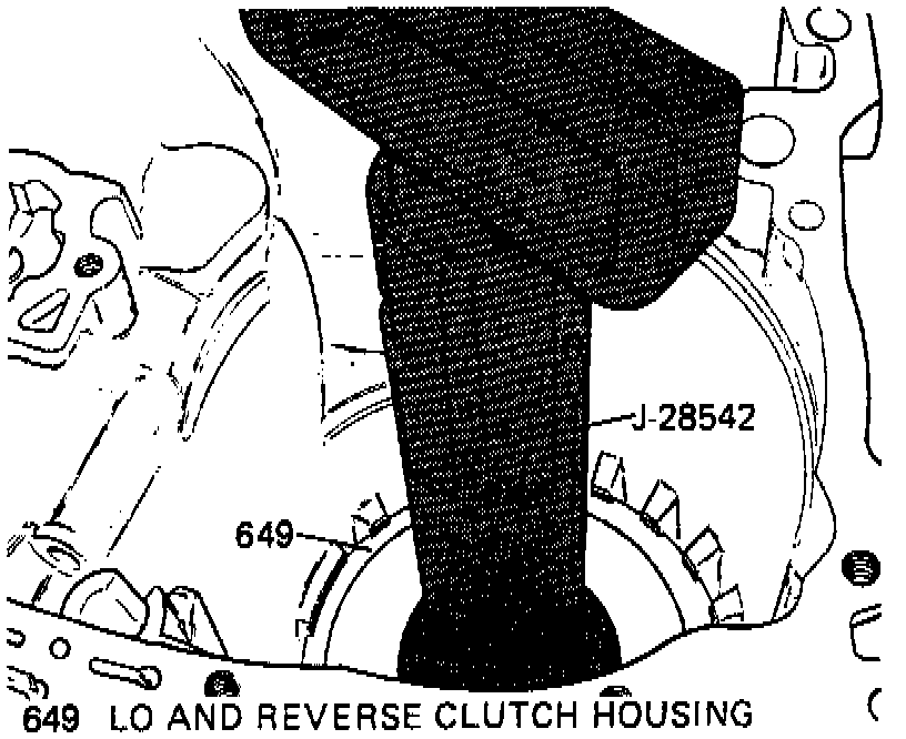 13. Using low-reverse clutch unit remover/installer tool No. J-28542 (1986-88) or No. J-34008 (1989-90) and adapter, install Low and Reverse clutch housing with its oil feed hole aligned with oil feed hole in the case Fig. 29. If Low and Reverse clutch housing does not seat past the snap ring groove, proceed as follows: