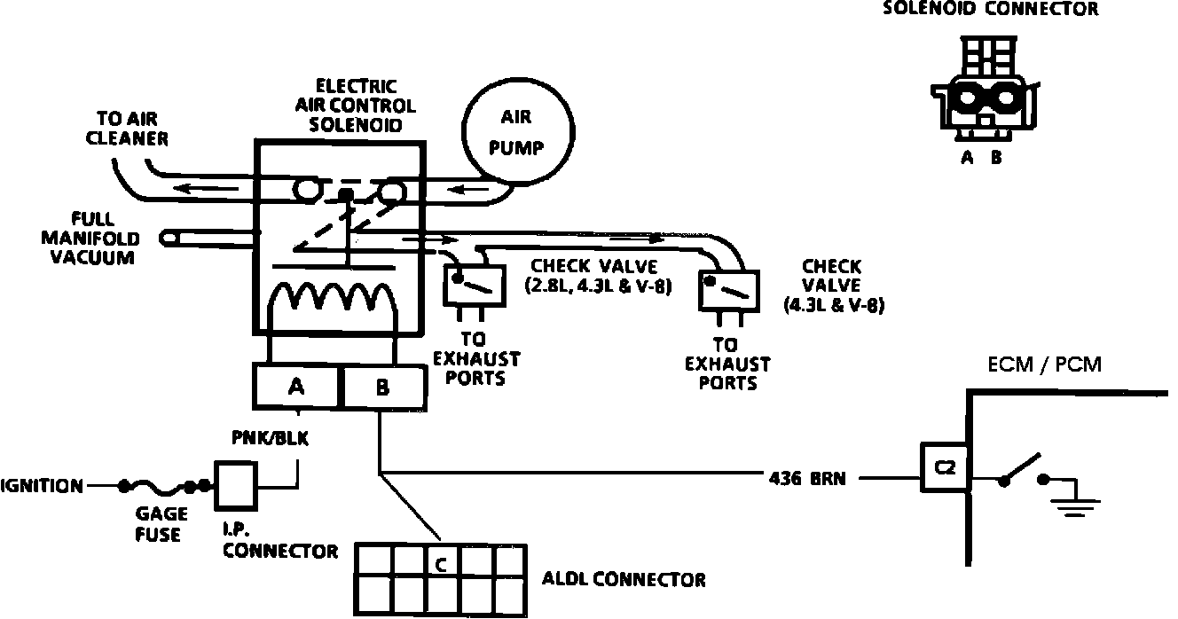 An electric air control valve solenoid directs air into the exhaust ports or the air cleaner. During cold start the ECM/PCM completes the ground circuit, the EAC solenoid is energized, and air is directed to the exhaust ports. As "coolant" temperature increases, or system goes to "Closed Loop", the ECM/PCM opens the ground circuit, the EAC solenoid is de-energized, and air goes to the air cleaner. If the system is not operating properly, check manifold vacuum signal (10" Hg (34kPa) at the valve and check the electrical circuit from the solenoid to the ECM/PCM.