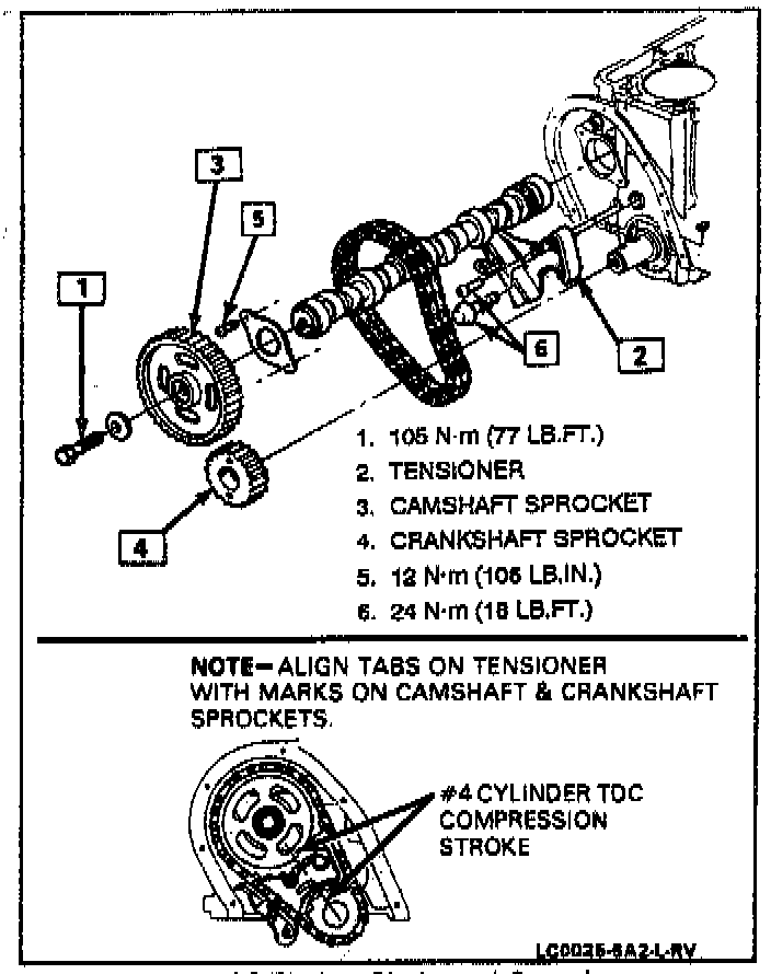 4. Align marks on camshaft sprocket and crankshaft sprocket with tabs on tensioner.