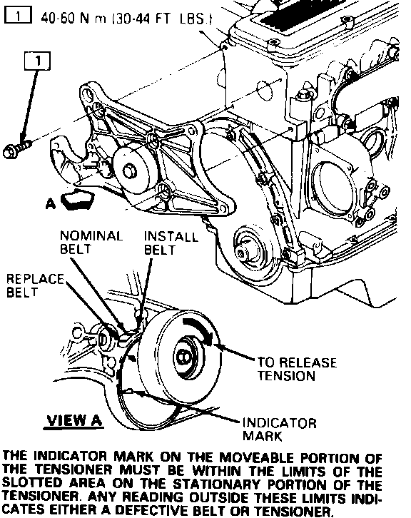 When installing or removing the drive belt, never exceed 30 ft. lbs. torque on the tensioner center bolt, Fig. 14. Care should also be taken to avoid bending or twisting the tensioner. If the belt tensioner or idler assembly produces a whining noise, inspect for bearing failure. If the drive belt becomes frayed, check belt tensioner assembly alignment and ensure belt edge does not contact the tensioner pulley flange.