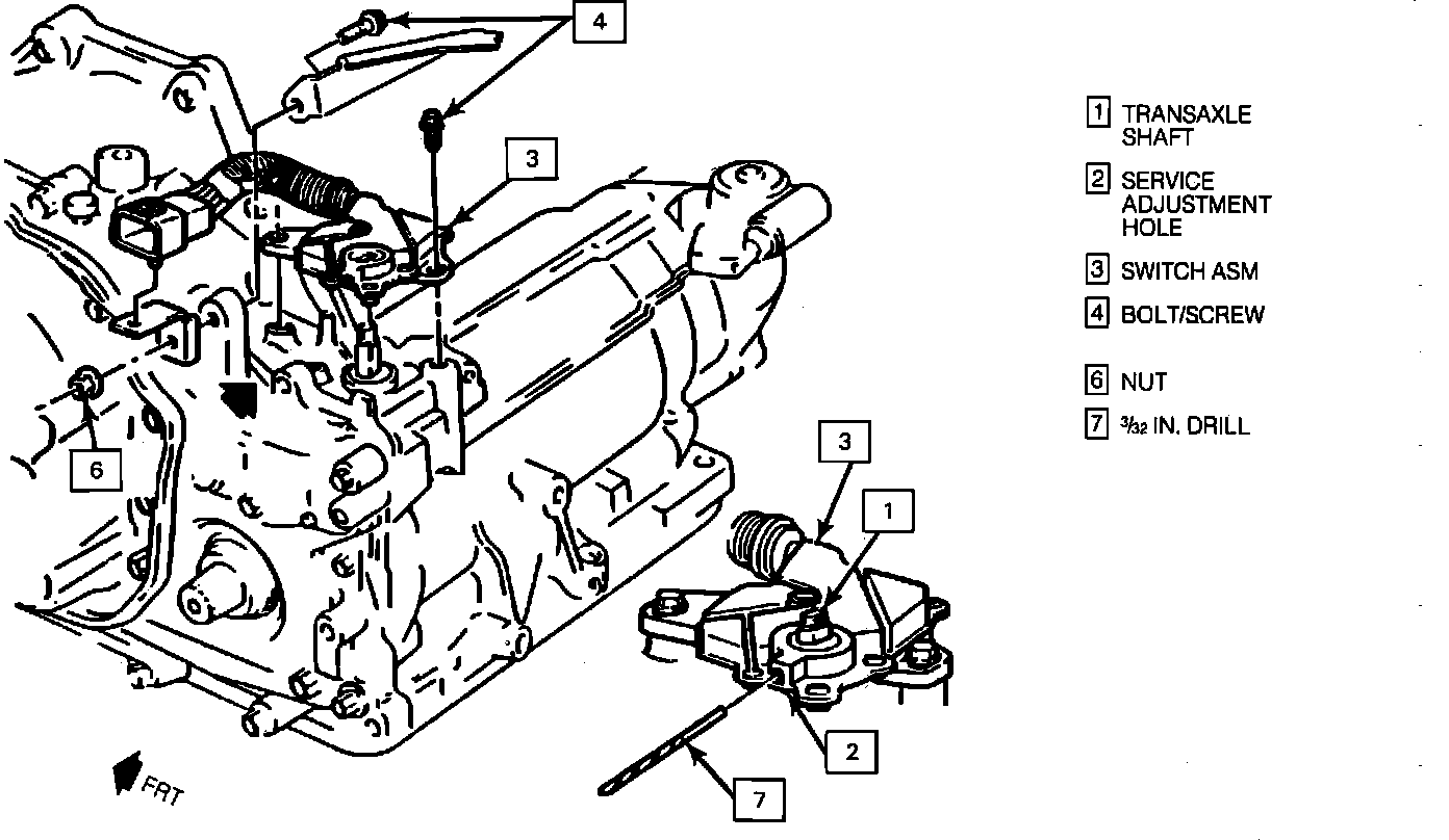 1. Remove negative battery cable, shift linkage, electrical connector, mounting bolts, and switch assembly.