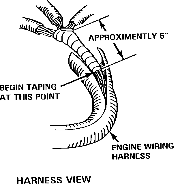 - Using common "black" electrical tape (locally attained part), begin taping approximately 5 inches back from the point where the main harness breaks out into 3 smaller harnesses.