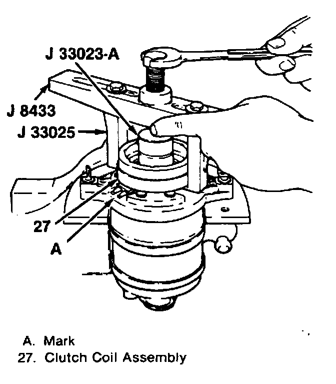 ^ Be sure J 8433-1 and the clutch coil assembly (27) stay "in line" during installation.