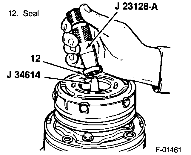 ^ Insert by turning handle clockwise, and then push J 34614, into seal lip. The stamped steel case side of the lip seal must be engaged with knurled tangs of installer so that flared-out side of lip seal is facing and installed towards the compressor.