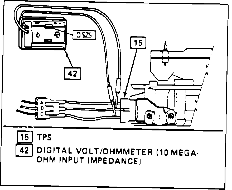 1. Disconnect TPS connector and connect jumpers between the harness connector and the TPS sensor. Connect a suitable digital voltmeter from TPS connector terminal A to center terminal B.