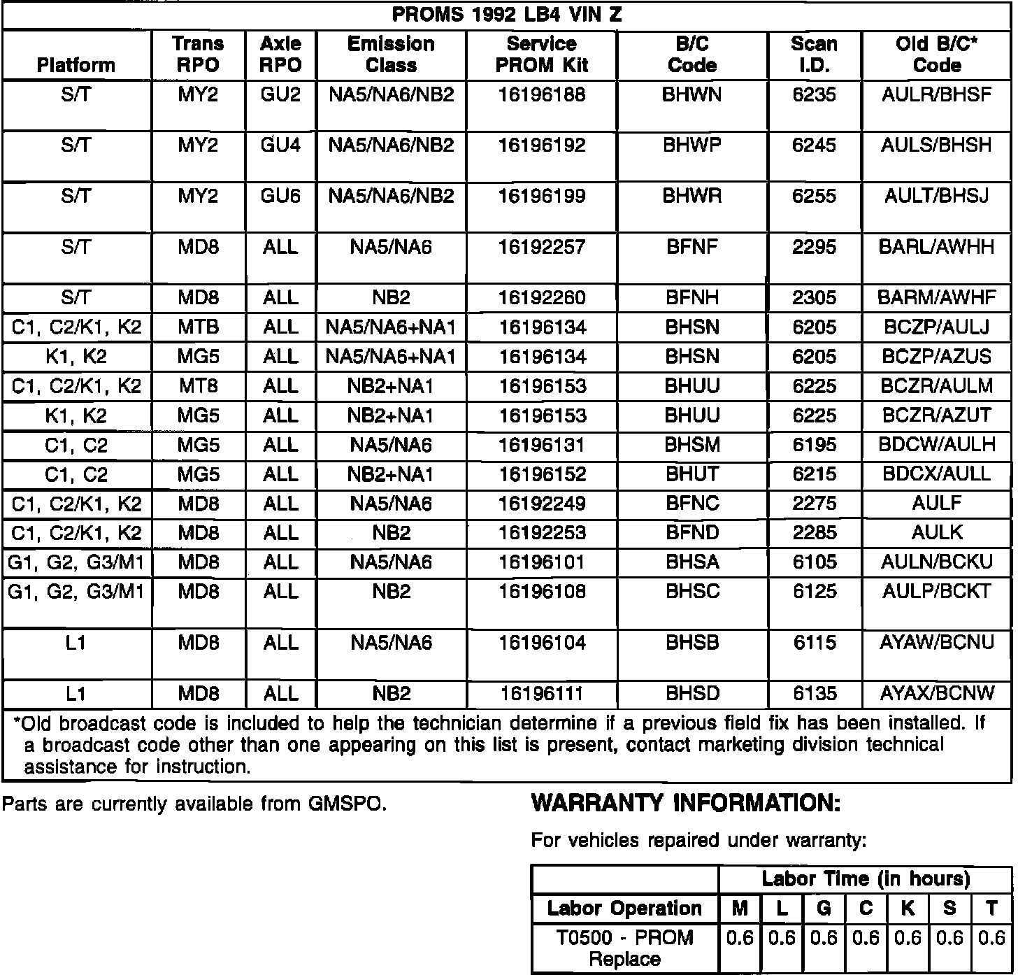 Use of a detonation field fix calibration PROM in a nondetonating engine may result in degraded driveability. General Motors strongly recommends the concern be properly identified as sustained detonation occurring after the engine is fully warmed to normal operating temperature.