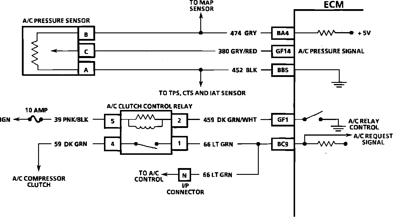 The A/C pressure sensor electrical circuit consist of a 5.0 volt reference line, a ground, and a signal wire to the ECM. The signal is a voltage that varies from approximately 0.1 volts at 0.0 psi to 4.9 volts at 450 psi or more. A problem with the A/C pressure circuits or sensor should set a Code 66 and will make the A/C compressor inoperative.
