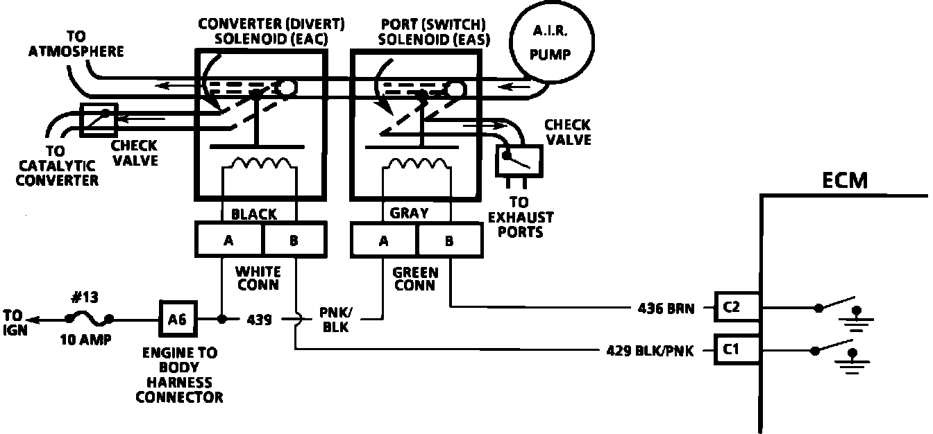 The air management system is controlled by a pressure operated port and an air switching valve (converter valve). Both valves are controlled by the ECM. When the solenoid is grounded by the ECM, the A.I.R. pump pressure will activate the valve and pump air will be directed as follows: