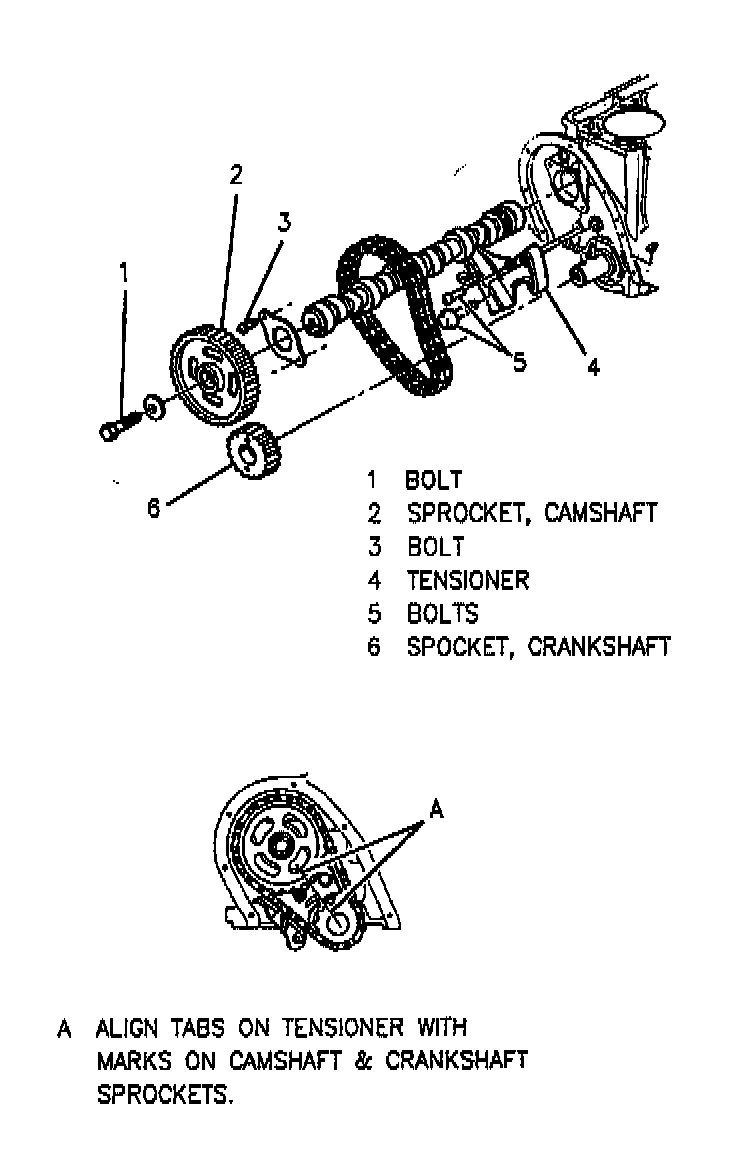 3. Align crankshaft and camshaft timing marks with "tabs" on tensioner.